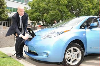 加州水与电力公司洛杉矶分部总经理罗纳德?尼科尔斯(Ronald Nichols)正在为一部日产聆风(Leaf)汽车充电。