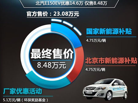 2014年,国家对于新能源汽车的补贴标准比去年降低了5%。从国家公示的工况补贴指标中我们发现,北汽E150EV电动车的续航能力所在区间所对应的补贴款为 4.75万元/辆。北京市政府也借鉴了国家给出的标准,补贴款同样为4.75万元。据北汽新能源4S店工作人员透露,虽然此次活动一直持续到8月份,但是北汽新能源只给予限量500名购买E150EV高配车型的每名车主5.1万元的优惠力度,厂商指导价为23.08万元的新车直降14.6万元,价格下探到10万元以下,售价也更加亲民。