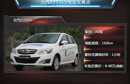 随着北京汽车新能源股份有限公司今年正式在京成立,北汽集团加快了新能源汽车领域的发展进程。北汽新能源在2014全年销量目标为2万辆,旗下北汽E150EV是目前唯一在售的电动车,其也肩负着“走量”的重任。近日网通社从北汽新能源官方了解到:现阶段在北京地区购买E150EV高配车型,除了可以享受到4.75万元的国家补贴和4.75万元的北京市政府补贴外,北汽新能源还将提供购车人高达5.1万元的“环保奖励基金”,优惠后新车售价仅为8.48万元。值得一提的是,北汽E150EV的续航里程为160公里。
