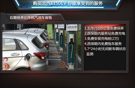 对于那些北汽E150EV电动车的车主们来说,车辆在使用过程中的费用要明显比传统汽油车节省很多。第一个要考虑的因素是燃料问题,该车百公里耗电量约为13度,按平均电价1元/度计算,折合人民币约13元/100公里;其次,购买E150EV车型还可享受到5年/10万公里质保期内的免费拖车和免费保养服务,并且在质保期内车辆电量消耗殆尽可以到服务站免费充电。至于人们普遍比较关心的充电设施问题,北汽新能源也给出了自己的承诺,在和当地物业协商好的前提下,将在10个工作日之内为每一名新车主免费安装价值2万元的个人充电桩。