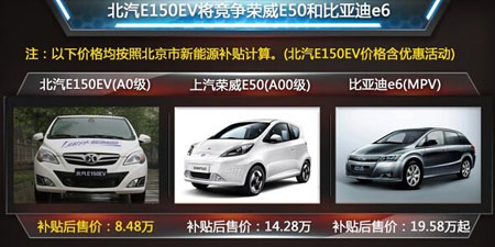北汽E150EV经过优惠后的价格仅为8.48万元,无论和A00级别的上汽荣威E50还是更大的比亚迪e6 相比都更具竞争力。而在这三款车中,由于比亚迪e6的车身更大,其所用的电池组容量也更大,续航里程高达300公里,E150EV的续航能力尚不能与之相比,但和级别更小的荣威E50 相比还是具有一定的优势。