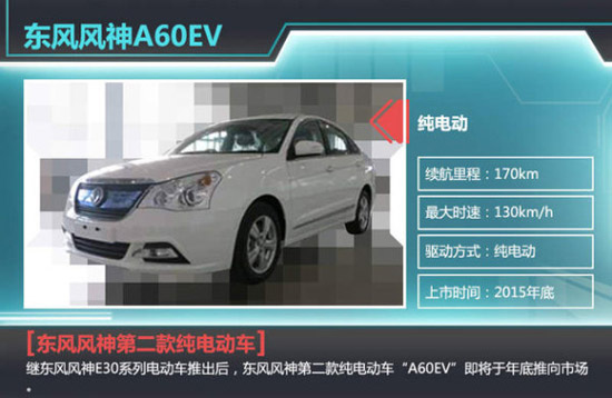 在去年北京车展上,东风汽车举行了东风风神E30纯电动车示范运营交付仪式,标志着东风全新平台纯电动轿车市场化的正式起航,而在新能源竞争愈加激烈的2015年,东风还将继续扩大新能源车型阵容,东风汽车公司技术中心商品企划部部长李瑾南曾表示:我们今年底会有第二款纯电动汽车投放市场。近日,东风汽车官方透露:东风新能源第二款车型,东风风神A60 EV即将与进入市场,该车最大续航里程170km,新车有望年底正式开始销售。