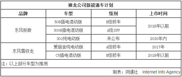神龙公司新五年的中期战略已经正式发布,其中包含了与两大股东方联合开发电动版共用模块化平台项目的签署。神龙汽车有限公司总经理邱现东向记者表示:“在新能源方面,2017年投放第一款纯电动车,2019年前投放三款插电式混合动力车,油耗低于百公里2.8升。”东风雪铁龙纯电动版爱丽舍已于北京车展正式亮相,新车预计2017年上市;在插电混动车型方面也将有三款新车相继投入市场;另外东风标致首款纯电动车有望在2020年内推出。未来五年内,神龙旗下的新能源产品将增至五款。