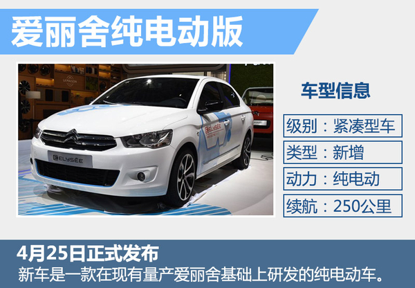 爱丽舍电动版车型已于4月25日北京车展正式发布,新车基于现款全新爱丽舍打造,车身长、宽、高尺寸分别为4,427*1,748*1,476毫米,轴距达到了2,652毫米。东风雪铁龙爱丽舍电动版采用85千瓦的驱动电机,峰值扭矩达到270牛米。消费者在选择纯电动车时,续航里程是最关注的性能参数之一,全新电动爱丽舍的续航里程可达250公里,并有望于2017年上市。