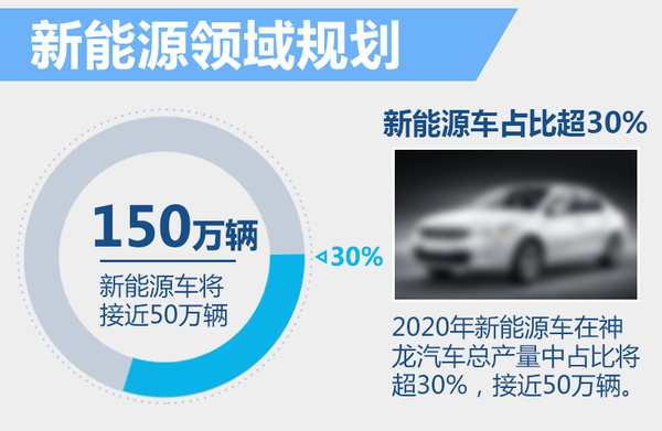在神龙公司的中期规划中,2017年产销突破100万辆,2020年达到将150万辆。新能源方面,预计到2020年前将实现插电式混合动力车、混合动力车及纯电动车的产业化,同时新能源汽车将在神龙汽车总产量中占比超30%。按照150万辆的目标来技术,神龙汽车未来新能源车将接近50万辆的年产量。此外,到2020年,神龙汽车旗下所有产品碳排放量预计将降低20%,进一步实现节能减排。