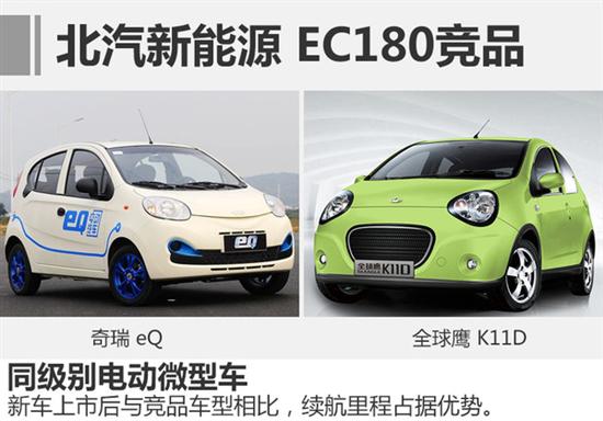 北汽新能源EC180与奇瑞eQ、全球鹰K11D所属同一细分市场,上市后将与二者展开市场竞争。其中,奇瑞eQ续航里程达200公里,全球鹰K11D续航里程达151公里,而EC180最大续航里程可达250公里,占据一定优势。