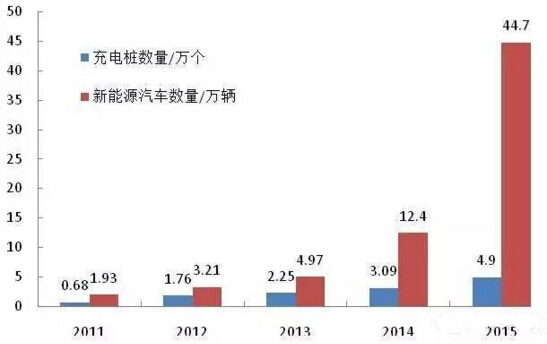 充电设施建设在2010年之前规模小,它们主要建设的就是集中式充换电站。充电桩数量的年增长率在2011年到2012年期间超过400%算是一个快速增长期。这个时期里充电设施的建设速度是快与新能源汽车的。2013年充电设施的建设要落后于预期规划,出现了一定的回落现象。2014年充电设施建设在政策和市场的作用下又重新开始加速。根据工信部的数据,截止到2014年底,我国建成充换电站723座、充电桩2.8万个,建设速度仍然远低于规划目标。在2015年底时,全国已建成充换电站3600座,公共充电桩4.9万个,较2014年底增加1.8万个,同比增速58%。