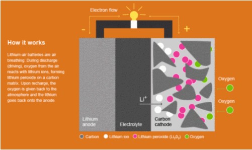 锂空气电池使用催化空气阴极将氧气转化成过氧化锂,一种电解质,和锂阳极。所以在同等重量下,锂空气电池的储电量是锂离子电池的10倍,而实现锂空气电池的这种潜能却是一项科学难题。IBM和它的伙伴一起开展了一项为期数年的研究,该研究致力于探索可充电锂空气系统的商业化可行性;项目被命名为Battery500project,意蕴希望电池一次充电能让电动汽车跑上500英里;如果把该指标折算成电池容量,这块车用动力蓄电池组大约需要125kWh左右的能量。