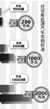 对于在武汉市投资生产新能源整车的重点企业,各类节能与新能源汽车年产销量首次突破1000辆、5000辆和1万辆的,武汉市将分别一次性奖励200万元、1000万元和2000万元。