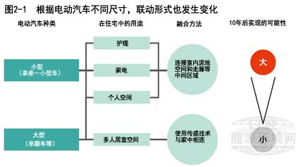 积水建房公司综合住宅研究所所长木村文雄称,根据电动汽车的体型大小,两者的融合大致可分为两种形式(图2-1)。一种是单厢大型车,另一种是轻型汽车级别的小型车及单座超小型车。其中,木村认为后者可与住宅进一步实现融合。