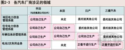 丰田正在与集团企业共同开发管理住宅电力的家庭能源管理系统(HEMS)。旗下拥有太阳能电池开发企业本田Soltec公司的本田,也在亲自动手的方针下进行着开发。而日产汽车及三菱汽车则重视将开发委托给其他公司、相互进行合作的模式。三菱汽车甚至采取行动,大胆地进入其他业界开拓的领域宣传自己想法。