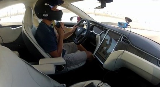 充满科技感的Tesla Model S内部(图为测试人员,所以戴了头盔)