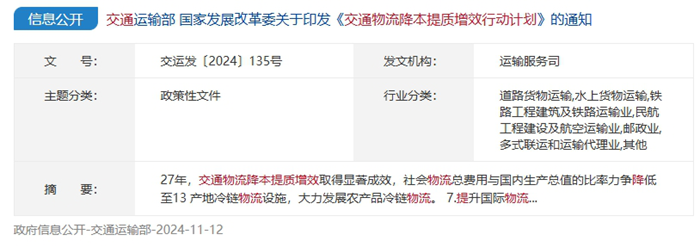 2024-08-09 展会交通运输部今年将加快完善综合交通运输服务体系,强化各环节高效衔接,加快发展智慧物流和绿色物流,推动交通物流降本提质增效,降低全社会物流成本。
