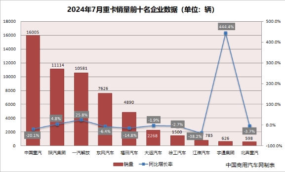 7月重卡销量同比下降5.0%,除了“新势力”宇通集团暴增之外,仅有陕汽集团、一汽解放和徐工汽车实现了销量的同比增长。