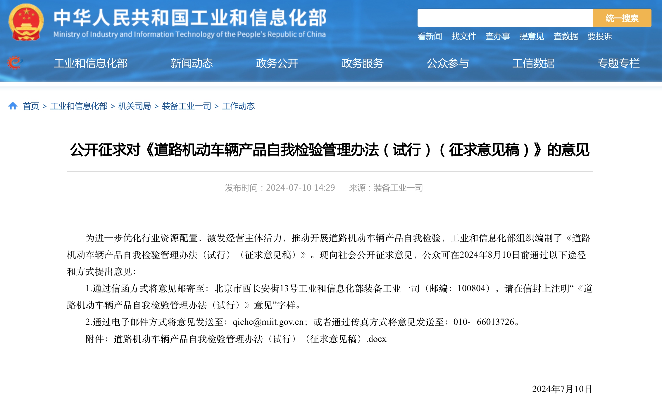 7月10日,工业和信息化部装备工业一司发布公开征求对《道路机动车辆产品自我检验管理办法(试行)(征求意见稿)》